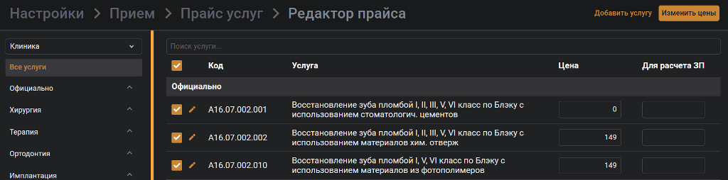 Механизм массового обновления прайса услуг через Excel был упразднён в виду наличия после вгрузки ошибок новая/старая услуга, которые влияли на расчет заработной платы, планы лечения и другие разделы.