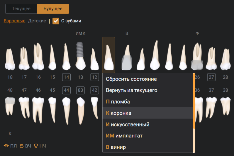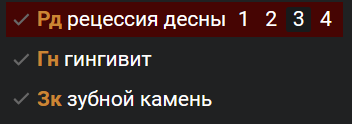 Помимо этого в зубную формулу добавлены новые значения: Рд рецессия десны, Гн гингивит и Зк зубной камень.