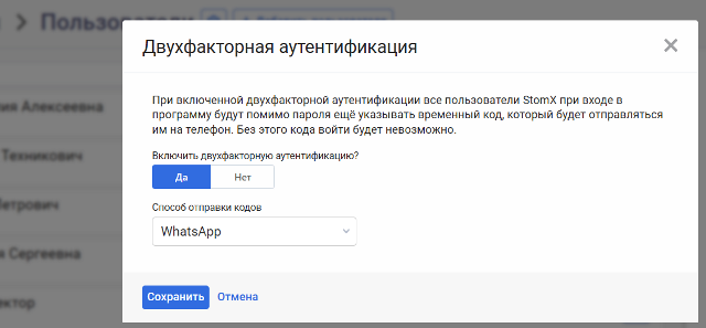 Важно! Перед включением этой опции удостоверьтесь, что у всех пользователей есть возможность получать код, если будете выбирать какой-то мессенджер. Мы рекомендуем для этих целей подключить интеграцию с СМС-Центром, так как на сегодня СМС самый стабильный канал.