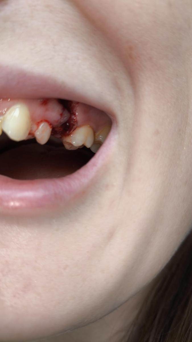 Я так понимаю, что разрыв десны был случайным, специально он её не резал, спереди стенка была тонкая и зуб крошился.