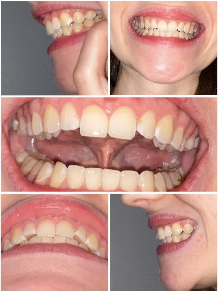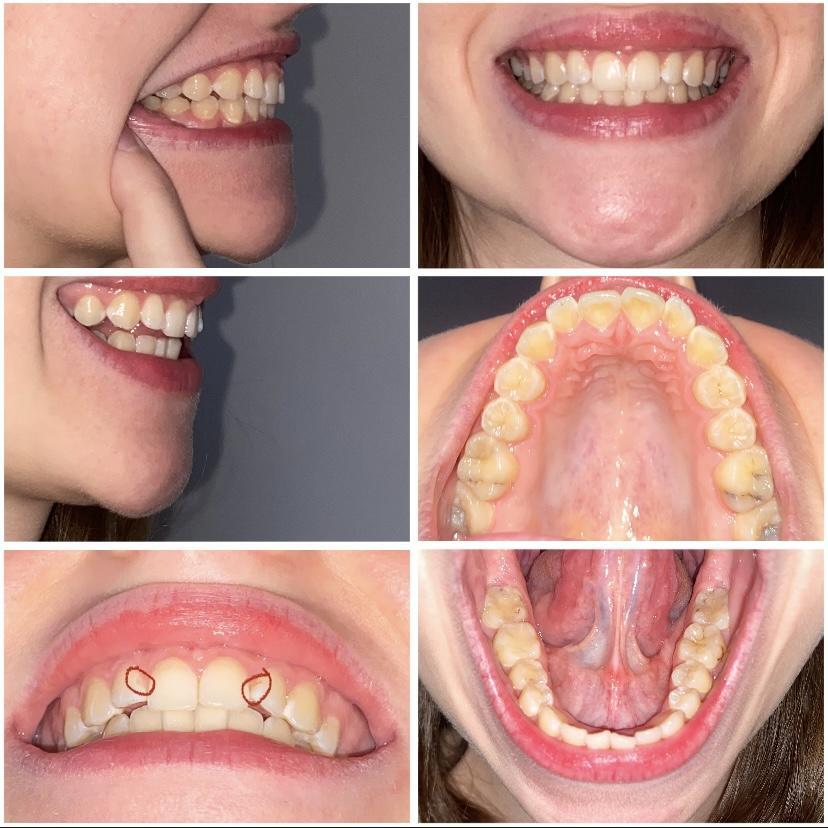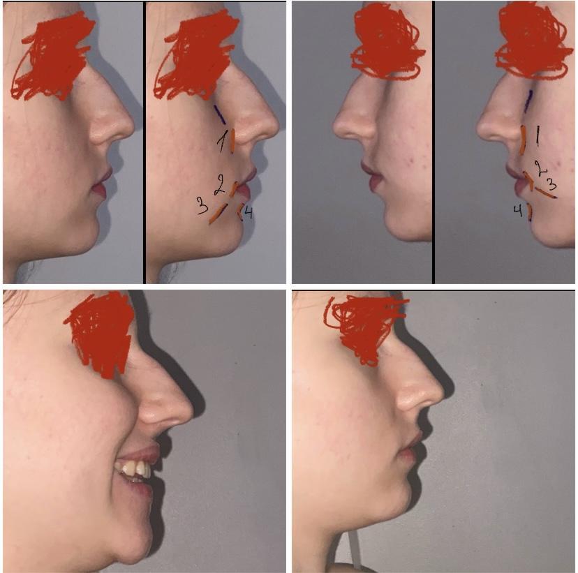 Всем привет и здравствуйте ! Хотелось бы узнать что это за прикус и какие еще есть особенности в моем прикусе, какими методами все описанное мной исправляется? У стоматологов и ортодонтов не была, предполагаю что дистальный. Беспокоит бруксизм и стираемость боковых резцов сверху сбоку( выделила красными кружками). Так же беспокоит эстетическая сторона вопроса, лицо выглядит каким то осунувшимся, линия 1 носогубки выглядит излишне впалой, да и лицо вытянутым и плоски, не нравится как выделяется линия 2-3 область вокруг рта, и линия 4 довольно сильно выделяющаяся складка подбородка, а так же выделяющийся второй подбородок при общей худобе, Исправляется ли это исправлением прикуса? Так же присутствует покатость носа, профиль выглядит птичим, при улыбке или разговоре покатость усиливается, присутствует ли у меня недоразвитие верхней челюсти? Потому что видела что например в некоторых случаях после проведния операции на верхней челюсти нос менял форму, и мой ли это случай или покатость носа в моем случае только от носа и зависит и проблемы прикуса и то как он смотрится внешне можно исправить без операции какими то расширительными аппаратами и брекетами?