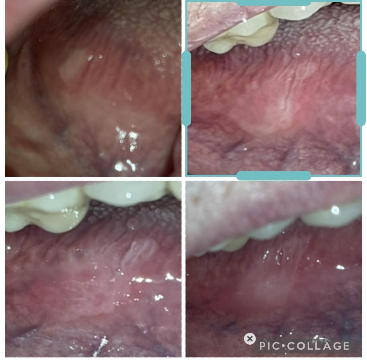 В пятницу вечером мама пожаловалась на неприятное ощущение сбоку языка. Я посмотрела и ничего не увидела. В субботу утром уже появилось небольшое белое пятно. Мама обработала его перекисью водорода. На следующий день пятно увеличилось. И так каждый день: пятно меняет размер и контур. Белый налёт местами с него стирается. Утром налёта больше, а днём, когда она пьёт и ест, становится меньше, частично стирается. Не болит, не твёрдое, но за эти 5 дней распространяется. Обрабатывает мирамистином. Афты во рту у неё раньше были в разных местах, но это не похоже на афту или это нетипичная афта. На грибок/кандиду тоже совсем не похоже. Очень переживаем не походе ли это на онкологию ? Что это может быть? Сделала коллаж по дням с субботы по среду ( сегодня). После обработки мирамистином белеет, но затем после еды этот налет стирается.