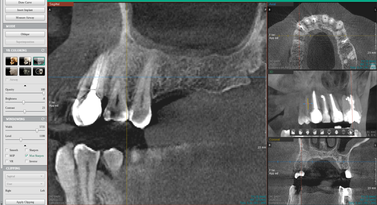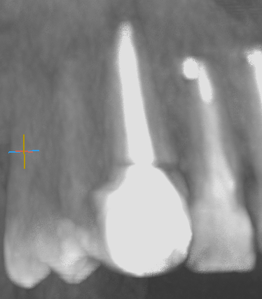 Делали 13 зуб, хронический периодонтит. Дистальная стенка ушла под десну. Делали эндо, врач почему-то решила сразу пломбировать каналы и сделать реставрацию композитом. Ничего не сказала, но на ОПТГ и КТ вот такая картина. Как будто трещина, да? Включая и материал в канале тоже - фрагментация какая-то...