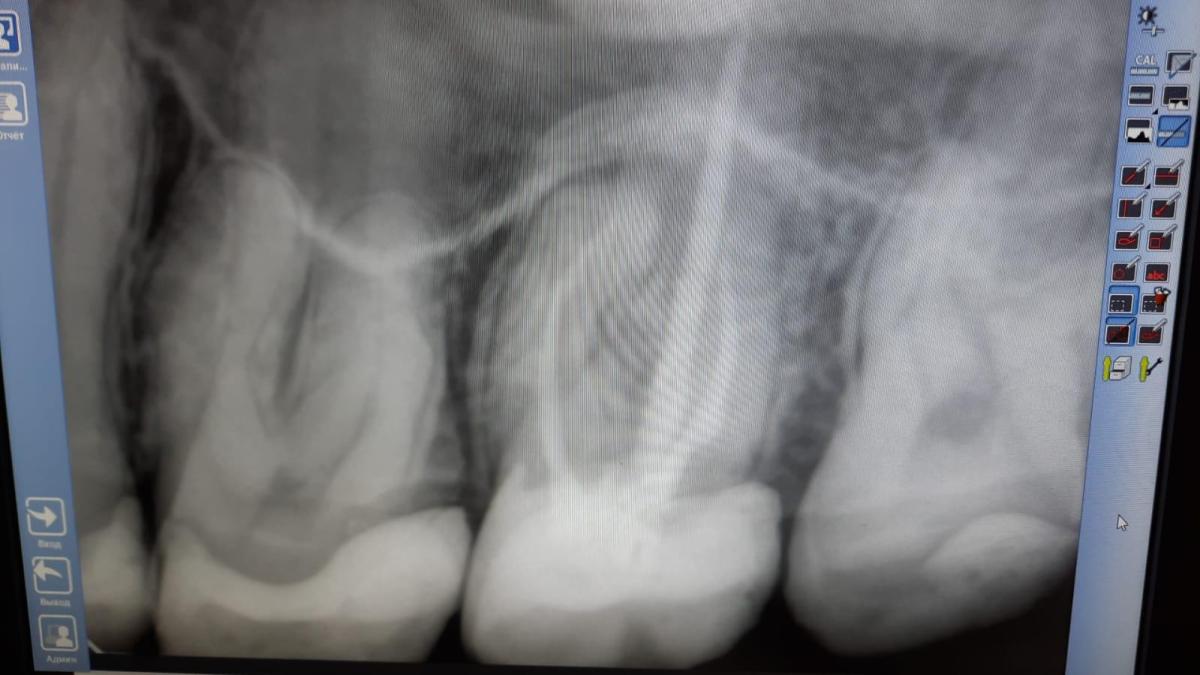 Откололся кусок зуба. Зуб с массивной пломбой и штифтом.