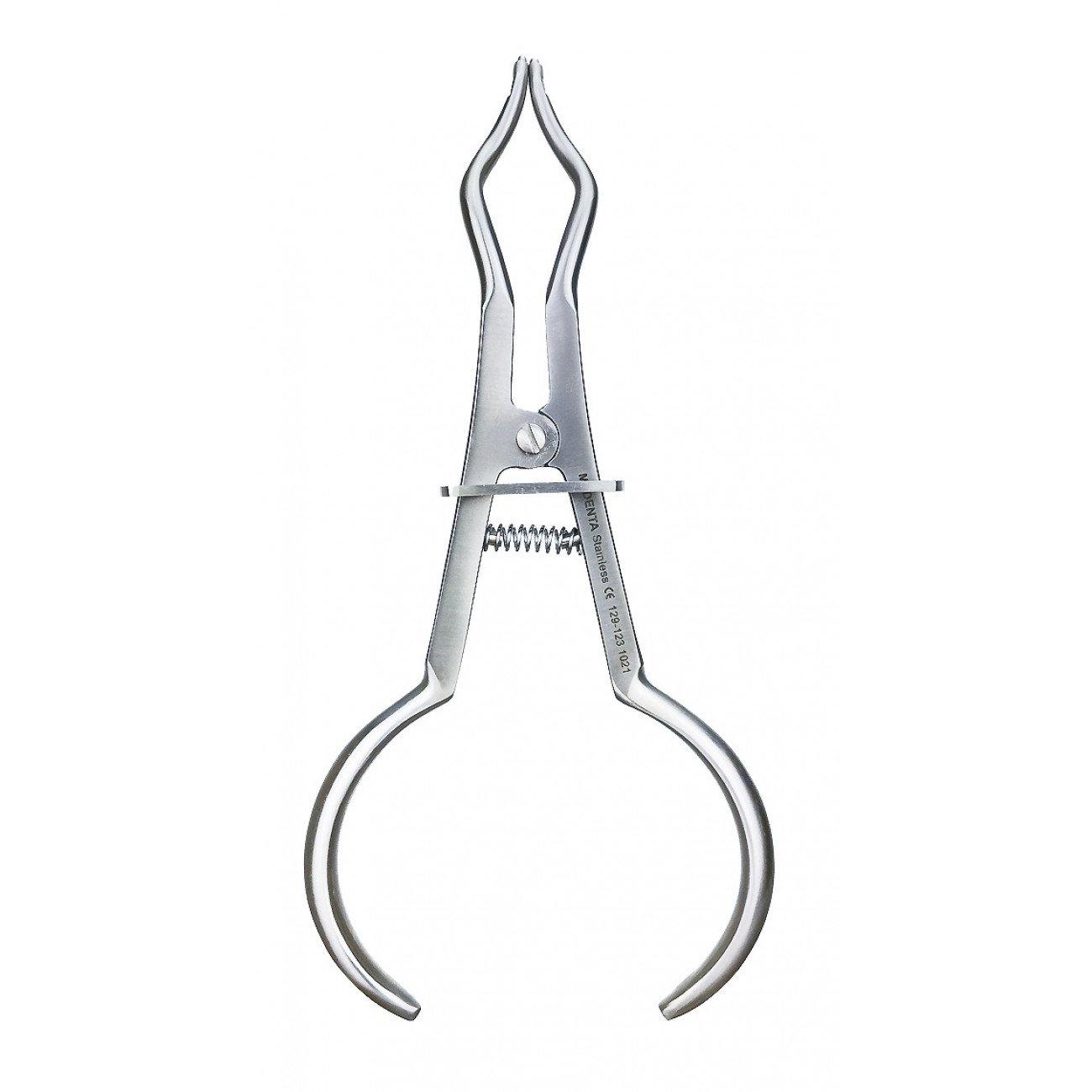 - Ретенционные шипы-шарики на “щечках” щипцов вводятся в отверстия на клампе, щипцы фиксируются в раздвинутом состоянии.