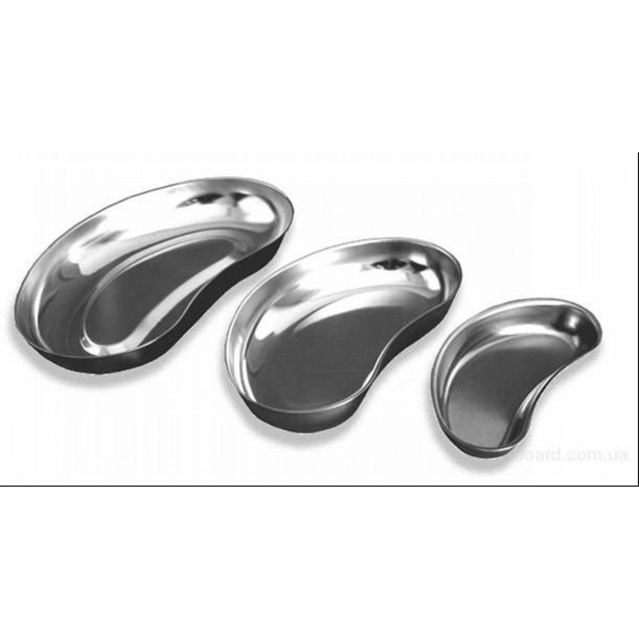 Лоток почкообразный (ЛМП). Нержавеющая сталь (обычно марки AISI 430 или AISI 304) — устойчивость к коррозии, совместимость с дезинфекцией и стерилизацией. Почкообразная (полулунная, с выемкой), что облегчает поднесение и удержание на ладони.