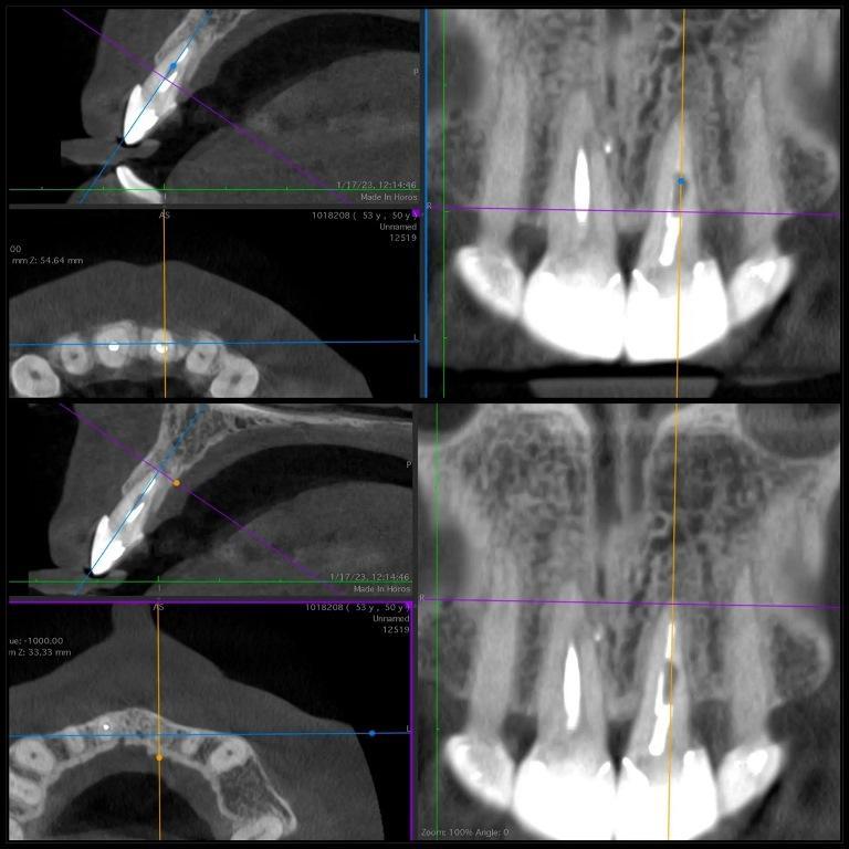 У пациентки случилась травма зубов верхней челюсти. У нее был косой перелом от мезиальной до дистальной части левого центрального резца верхней челюсти на поддесневом уровне. Штифт и металлокерамическая коронка были подвижны. Периапикальная ткань зуба была здоровой (фото 1). При рентгенологическом и клиническом обследовании было отмечено, что структура зубов недостаточна для предсказуемого восстановления. Планирование лечения включало измерение и анализ длины корня, ширины стенок корневого канала и имеющейся наддесневой структуры. Для сохранения зуба были рассмотрены различные варианты лечения, и после всесторонней оценки хирургическая экструзия была выбрана в качестве предпочтительного варианта для достижения адекватной здоровой наддесневой структуры зуба, тем самым предлагая пациентке благоприятное долгосрочное решение для лечения.