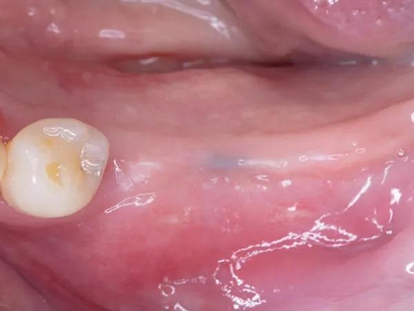 После проведения адекватной анестезии был сделан разрез десны в области левого третьего моляра нижней челюсти и первого и второго премоляров, с гребневым разрезом в участках адентии, рассекающим имеющуюся кератинизированную десну. Затем провели удаление третьего моляра и второго премоляра и тщательно очистили лунки от всех гранулематозных тканей с последующим обильным орошением солевым раствором.
