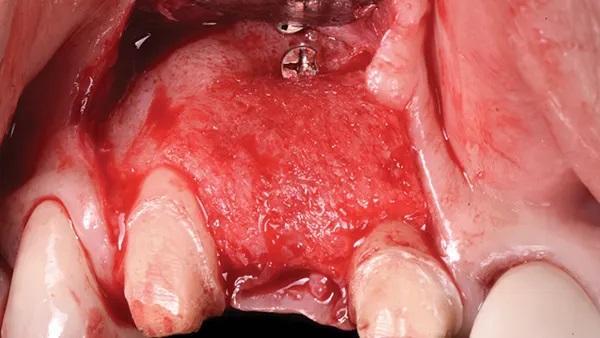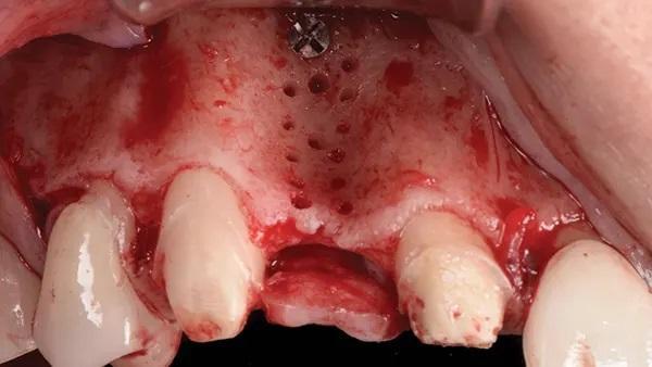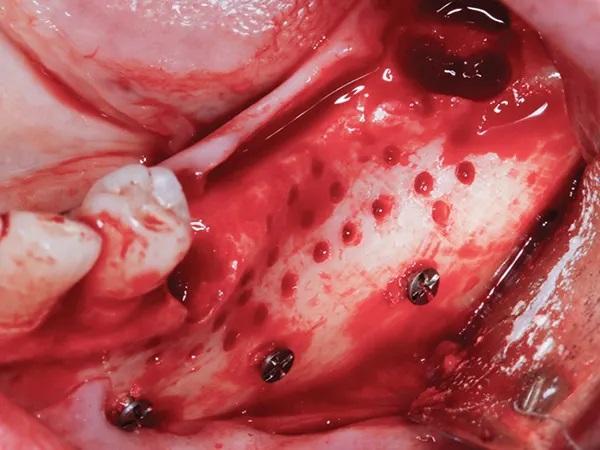Фото 4: Винты для фиксации мембраны, закрепленные на апикальном участке дефекта, и отверстия в костный мозг на буккальной стороне альвеолярного гребня.