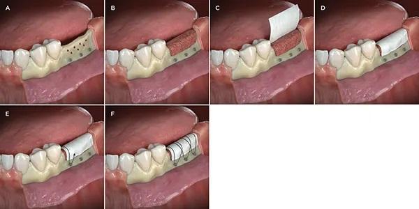 Фото 1: Техника использования винтов для фиксации мембраны в качестве анкеров для стабилизирующих мембрану швов. (A) Полное освобождение лоскута, удаление коркового слоя кости и установка винтов на 3-5 мм за пределы дефекта; обратите внимание, что головки винтов находятся на 0,5-1 мм выше буккального края остаточного гребня. (B) Костный трансплантат, адаптированный к дефекту. (C, D) Резорбируемая мембрана обрезана и подогнана к дефекту. (E) Первоначальный шов, закрепленный вокруг первого винта, наложенный на коллагеновую мембрану и проходящий через небный лоскут изнутри наружу, снова проходящий через небный лоскут снаружи внутрь (от надкостницы к эпителию). (F) Наложение швов, повторяющее процесс вокруг оставшихся винтов для обеспечения стабилизации мембраны.