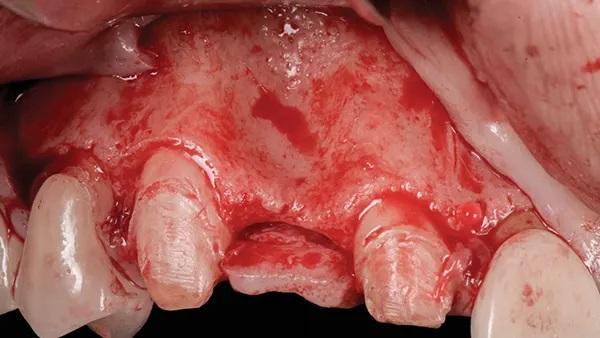 Фото 12: (Случай 2) Полнослойный разрез с освобождением лоскута в области угла мезиальной линии верхнечелюстного правого бокового резца и премоляра, обнажающий область клыка; обратите внимание на сильный дефицит горизонтального гребня.