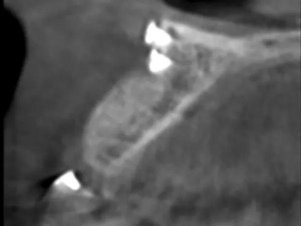 Женщина, 45 лет, с неотягощенным анамнезом, обратилась по поводу замены правого латерального резца верхней челюсти. После освобождения лоскута был выявлен сильный дефицит горизонтального гребня с остаточной шириной кости от 3 мм до 4 мм, что подтверждает данные КЛКТ (Фото 12 и Фото 13).
