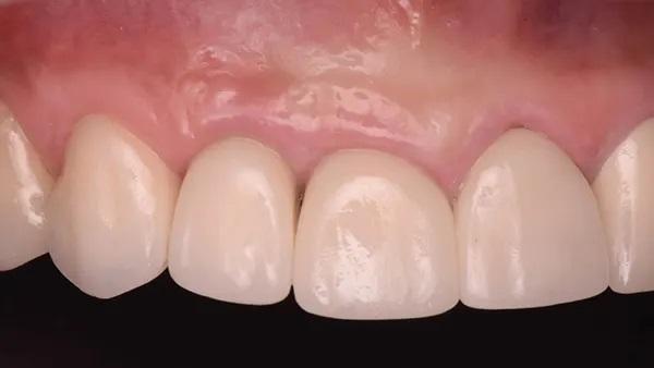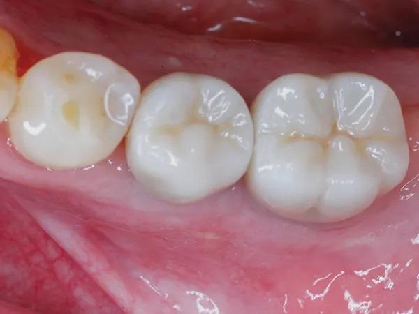 Фото 20: Окончательная реставрация, вид с буккальной стороны, 4 месяца после установки имплантата.