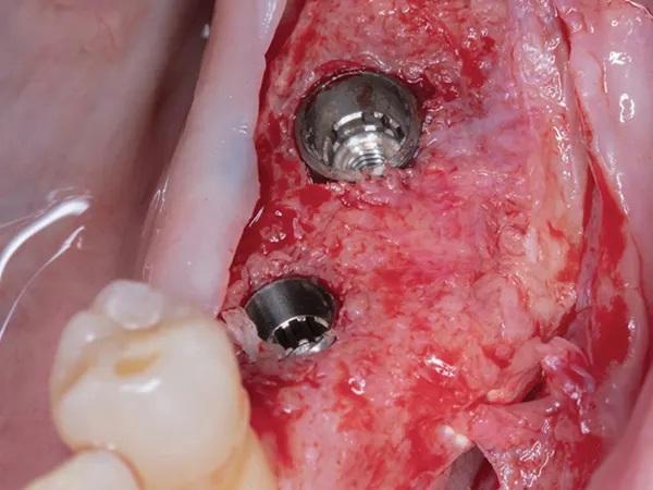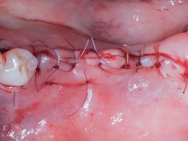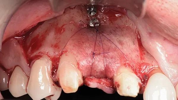 В итоге первичное ушивание выполняют обычным способом, используя несколько горизонтальных матрасных швов, чтобы снять напряжение с края лоскута и обеспечить двухслойное ушивание, после чего накладывают несколько одиночных прерывистых швов по всей длине лоскута. Место заживления оставляют на достаточное время в зависимости от используемого трансплантационного материала. Поскольку фиксирующие винты изготовлены из биосовместимого титанового сплава, их извлечение во время операции по установке имплантата не требуется. Для этой техники можно использовать различные имеющиеся в продаже фиксирующие винты и/или мембранные пины.