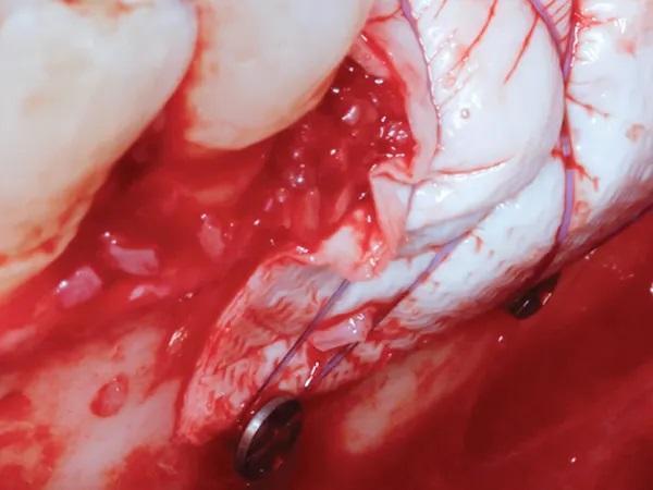 Фото 5: Зафиксированная коллагеновая мембрана поверх трансплантата с использованием рассасывающихся швов, проходящих через язычный лоскут и закручивающихся вокруг самого переднего фиксирующего винта.