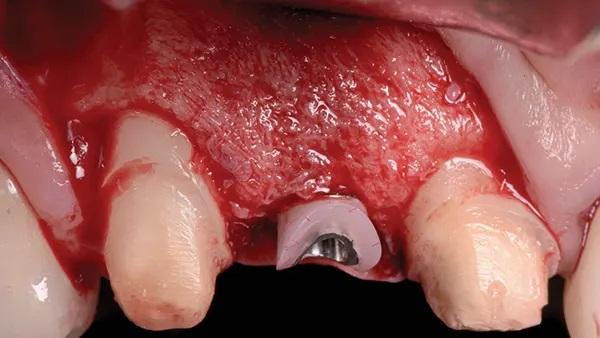 Фото 19: Установка имплантата с индивидуально подобранным формирователем десны для создания идеального профиля выступания.