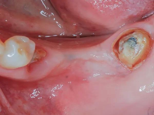 Женщина, 63 года, с неотягощенным анамнезом, явилась для восстановления левого квадранта нижней челюсти; в нем отсутствовали левые первый и второй моляр, а также были поражены второй премоляр и третий моляр, причем последний был наклонен мезиально из-за преждевременной потери второго моляра (Фото 2 и Фото 3). Было запланировано удаление разрушенных зубов с одновременным восстановлением гребня на участке дефекта от второго моляра до первого премоляра с помощью костного трансплантата и рассасывающейся коллагеновой мембраны.