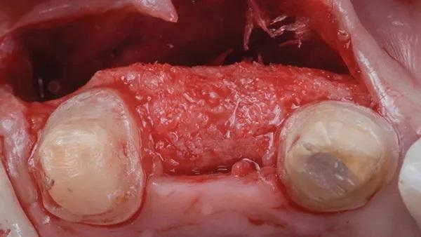 Фото 17: Откидывание лоскута на всю толщину, вид с буккальной стороны, демонстрирующий регенерацию костного дефекта.