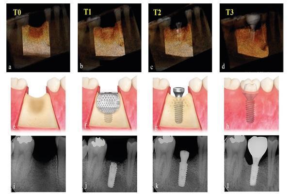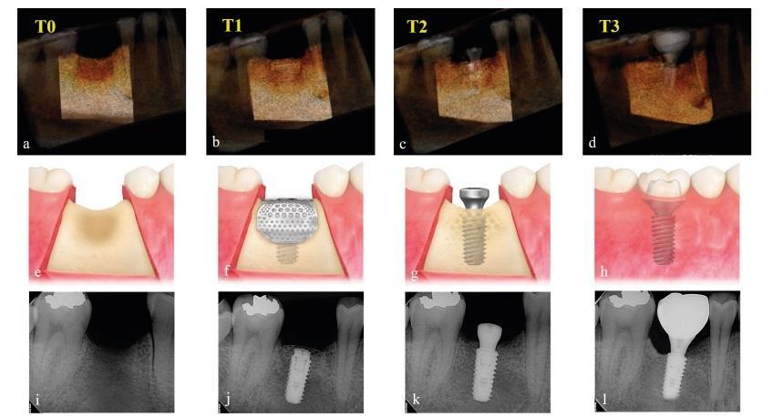 Рис. 4. Снимки КЛКТ, схематические изображения и прицельные рентгенограммы на разных этапах наблюдения. Объем регенерации рассчитали по 3D-реконструкции изображений КЛКТ с помощью ПО Aquarium iNtuition, версия 4.4.12 (TeraRecon, Дарем, Северная Каролина, США). T0 – до вмешательства (а, е, i), T1 – cразу после имплантации и НКР (b, f, j), T2 – после раскрытия имплантатов (с, g, k), T3 – на этапе окончательного протезирования (d, h, l)
