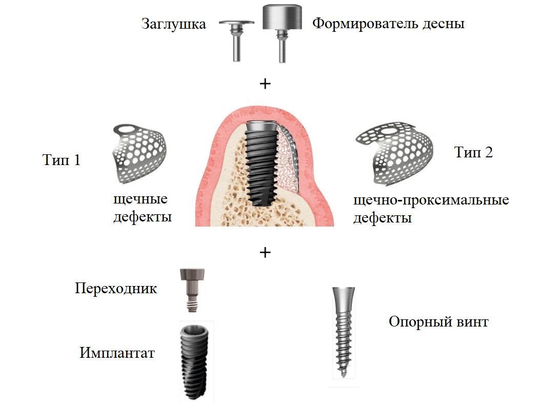 Рис. 3. Компоненты титановой 3D-мембраны, использованной в рамках этого исследования для устранения щелевидных костных дефектов в области имплантатов