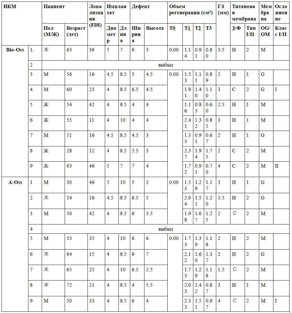 НКМ – неорганический костный материал бычьего происхождения, ГЗ – глубина зондирования, З – заглушка, Ф – формирователь десны, OG – OssGuide, OM – OssMem hard. Тип I – титановая 3D-мембрана для устранения щечного щелевидного дефекта; тип II – титановая 3D-мембрана для для устранения комбинированного щечно-проксимального щелевидного дефекта. Класс I – небольшое обнажение мембраны (≤3 мм) без экссудации; класс II – значительное обнажение мембраны (>3 мм) без экссудации. T0 – до вмешательства, T1 – сразу после имплантации и НКР, T2 – после раскрытия имплантатов, T3 – на этапе окончательного протезирования.
