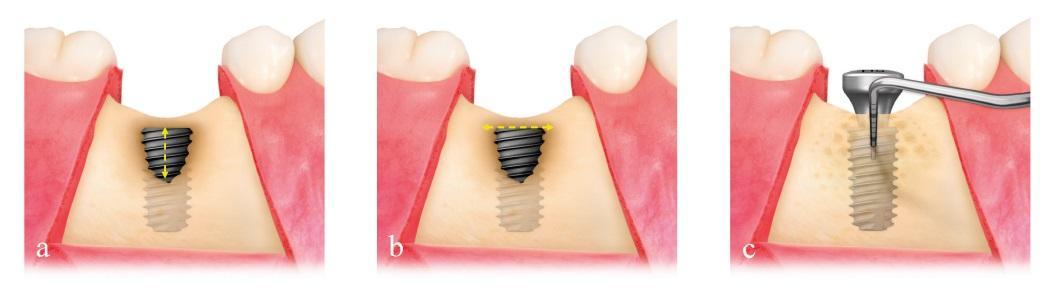 Рис. 2. Измерение высоты (а) и ширины дефекта (b) для определения его размера, а также оценка плотности регенерированной кости путем измерения глубины зондирования (с)