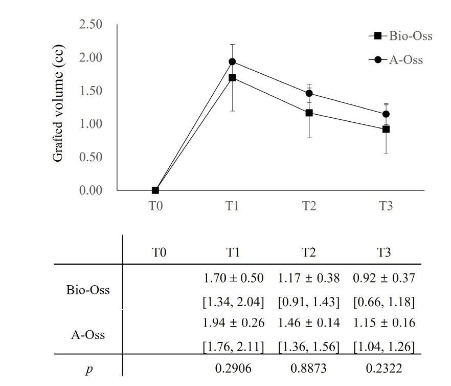 Разницу в изменениях объема регенерации в группах Bio-Oss и A-Oss изучали с помощью смешанной модели с поправкой на ковариаты при измерениях в трех последовательных временных периодах, а также на исходном уровне (T0). Значимость ковариатных эффектов и прогнозируемых изменений объема проверяли при α = 0,05. Описательная статистика проводилась с указанием средних значений (СЗ)±стандартное отклонение (СО) для количественных переменных и с указанием процентов для качественных переменных.