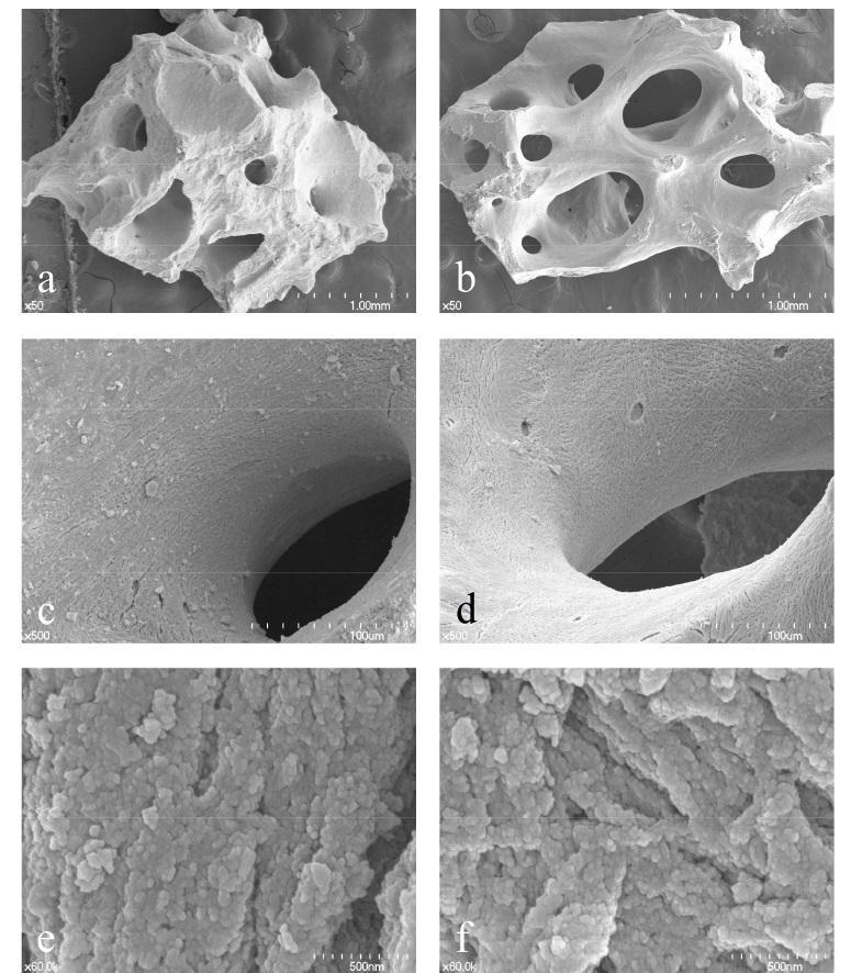 Рис. 1. Сравнительная сканирующая электронная микроскопия материалов Bio-Oss и A-Oss. Частицы Bio-Oss при увеличении ×50 (а), ×500 (с) и ×60 000 (е); частицы A-Oss при увеличении ×50 (b), ×500 (d) и ×60 000 (f)