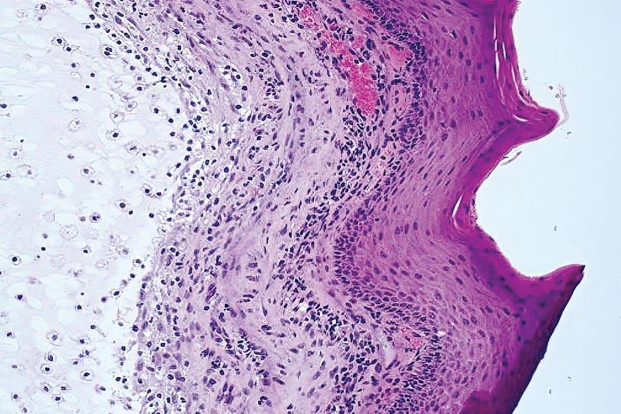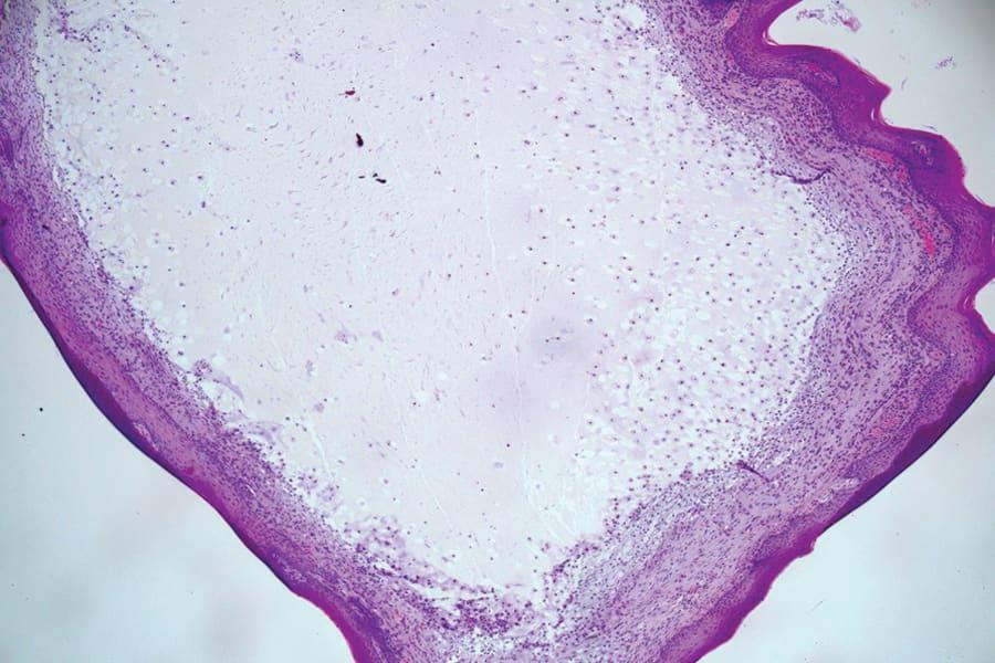 Фото 6. Многослойный плоский эпителий полости рта с гиперпаракератозом и неровной поверхностной архитектурой перекрывает фиброваскулярную соединительную ткань и стенку из грануляционной ткани вокруг вытекшего муцина, формирующего кистоподобную полость. Окраска гематоксилином и эозином; увеличение ×200.