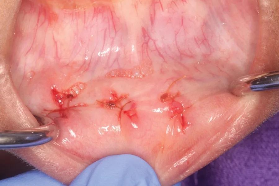 Лечение проведено на повторном приеме и включало седацию закисью азота, местную анестезию и эксцизионную биопсию всех трех образований посредством рассечения скальпелем. Удаленные образования направлены на гистологическое исследование. Раны ушиты кетгутом 5-0 (хромовым) (Фото 2). Даны послеоперационные рекомендации, включая прием ибупрофена при послеоперационном дискомфорте. Пациентка не явилась на непосредственный послеоперационный осмотр, однако через 3 месяца с ней связались, и был предоставлен фотоснимок, подтверждающий полное заживление трех биопсийных участков (Фото 3).