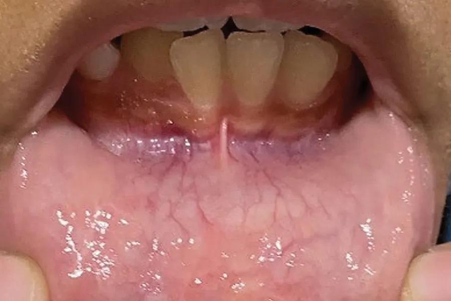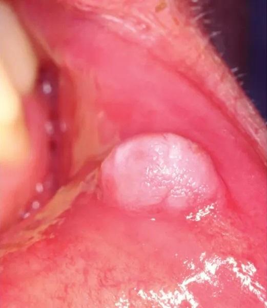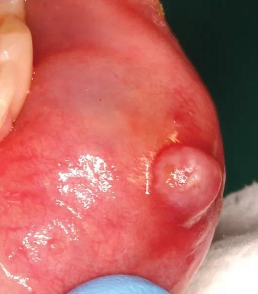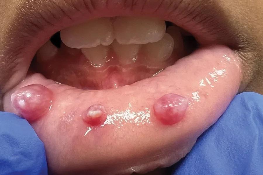 Настоящий клинический случай необычен по двум причинам. Во-первых, у пациентки было три образования на нижней губе, выглядевших как узелковые, по цвету слизистой, поражения, клинически соответствующие мукоцеле или фиброме раздражения (Фото 1). Поиск в литературе с использованием PubMed и Ovid Medline подтвердил редкость наблюдения: обнаружен лишь один описанный случай множественных мукоцеле. Во-вторых, все три образования были плотными при пальпации и проявляли признаки гиперкератоза, что затрудняло дифференциацию мукоцеле и фибромы раздражения без гистологической верификации (биопсии).