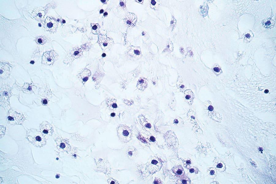 Фото 5. Вытекший муцин поглощается пенистыми гистиоцитами (муцифагами). Окраска гематоксилином и эозином; увеличение ×400.