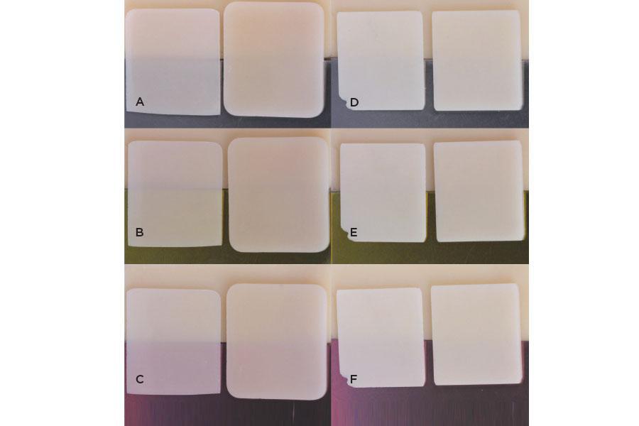 Фото 8. Пластинки литий-дисиликата (A, B, C) и циркония (D, E, F) толщиной 0,5 мм (слева) и 1,0 мм (справа) над блоками дентинного композита (верхние ряды) и титана (нижние ряды): неанодированный (A, D), золото-анодированный (B, E) и розово-анодированный (C, F).