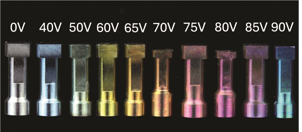 При использовании раствора ТНФ золотистый оттенок достигается при 60–65 В, розовый — при 70–80 В. Для ТНФ представлена цветовая шкала в зависимости от напряжения (Фото 6). При использовании 1М ортофосфорной кислоты золотые оттенки достигаются при 50–60 В, розовые — при 65–70 В.