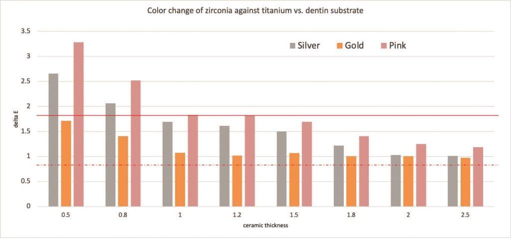 Результаты (Фото 9 и Фото 10; горизонтальная сплошная красная линия — порог приемлемости; пунктирная — порог различимости) подтвердили данные предыдущих работ: золотое анодирование титана улучшает совпадение по цвету, тогда как розовое — ухудшает, для обеих керамик. Для литий-дисиликата клинически приемлемое совпадение с фоном «дентин» достигалось при толщине 1,0 мм на фоне золото-анодированного титана и при 1,8 мм — на фоне неанодированного титана; на фоне розово-анодированного титана этот порог не достигался. Для циркония приемлемое совпадение достигалось уже при 0,5 мм на фоне золото-анодированного титана и при 1,0 мм — на фоне неанодированного и розово-анодированного титана.
