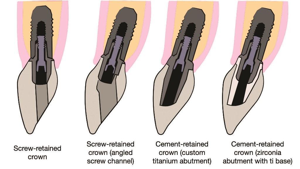 Некоторые клиницисты предпочитают индивидуальные титановыe абатменты вместо циркониевых на титановом основании для цементно фиксированных коронок (Фото 1, C), чтобы избежать технических проблем со связью между титановым основанием и циркониевым абатментом. Однако проблема «просвечивания» при титановом абатменте выраженнее, чем при циркониевом. По данным упомянутого опроса, коронки на цементной фиксации изготавливают из диоксида циркония (42%), литий-дисиликата (33%) или металлокерамики (25%). Металлокерамика не зависит от цвета подлежащего титана, тогда как относительно транспарентные керамические материалы — зависят. Коронки можно сделать толще, чтобы лучше блокировать цвет титана, однако толщину ограничивает необходимое пространство для достаточной толщины стенок абатмента.