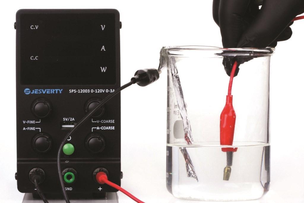 Фото 5. Схема анодирования титановогo абатмента. Источник постоянного тока — блок питания (слева). После подключения к положительной клемме (красный провод) абатмент имплантата погружают в электролит.