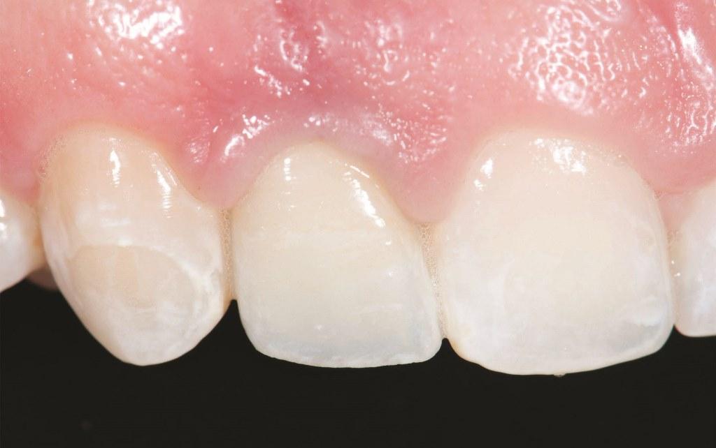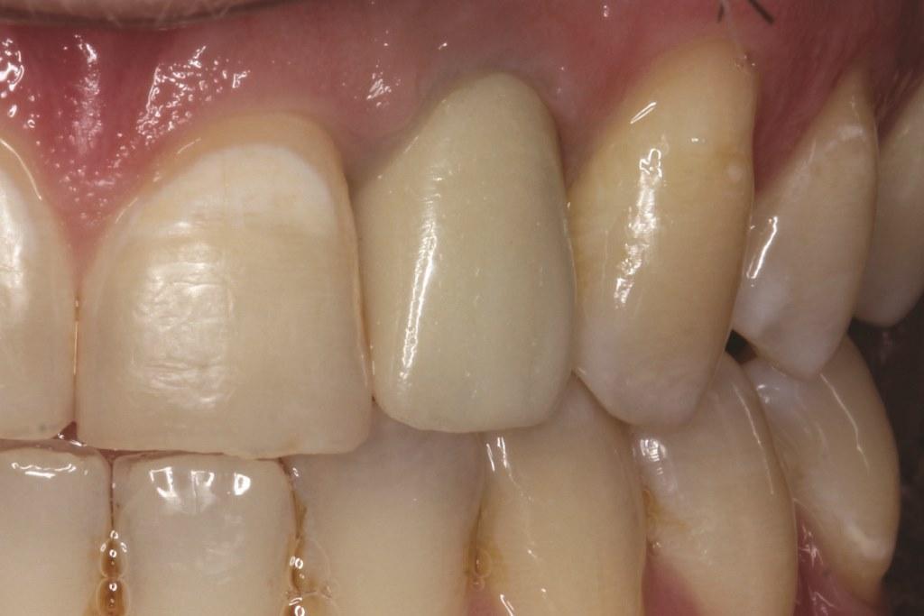 Фото 2. Титановый абатмент просвечивает через мягкие ткани в области передней имплантатной реставрации на верхнем левом латеральном резце.