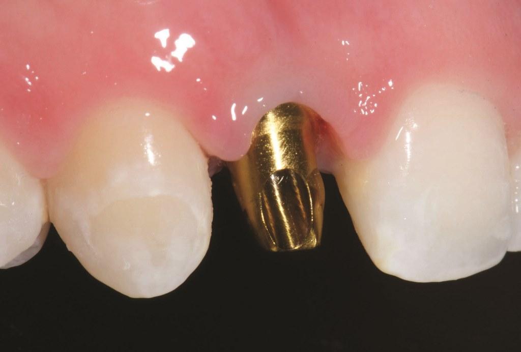 Фото 3. Индивидуальный титановый абатмент после золотого анодирования, подготовленный к фиксации коронки.