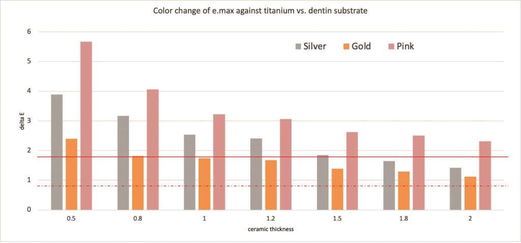Ряд исследований показал, что золотое анодирование титановогo абатмента позволяет эффективнее согласовывать цвет литий-дисиликатных коронок с окружающими зубами. В одном исследовании образцы литий-дисиликата толщиной 1,0; 1,5 и 2,0 мм фиксировали на золото-анодированных и неанодированных титaновых блоках; затем сравнивали их цвет с эталоном — 5-мм блоком литий-дисиликата. Золотое анодирование обеспечивало лучшее совпадение цвета литий-дисиликата для всех толщин. В другом исследовании образцы литий-дисиликата (толщиной 1,0–2,5 мм) сравнивали на фоне циркония, золото-анодированного титана и неанодированного титана. Литий-дисиликат на фоне золото-анодированного титана совпадал с литий-дисиликатом на фоне дентина (оттенок A2) лучше, чем на любом другом фоне.