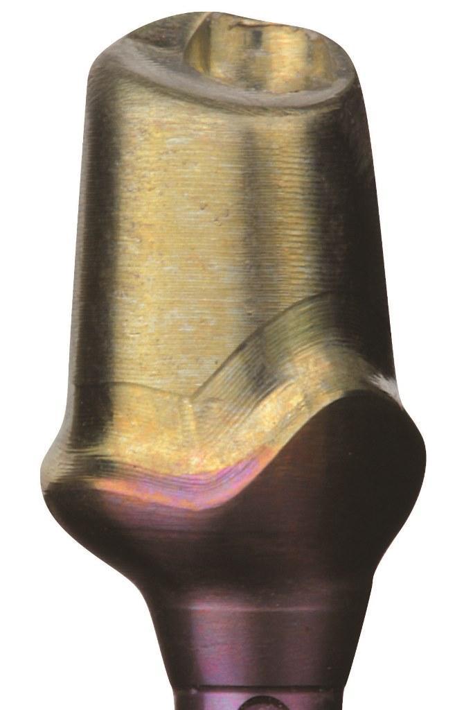 Фото 7. Абатмент с субгингивальной частью, анодированной в розовый цвет, и корональной, анодированной в золотой: демонстрация возможности получать разные цвета на одной детали.