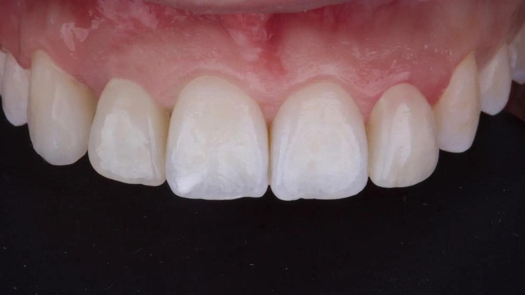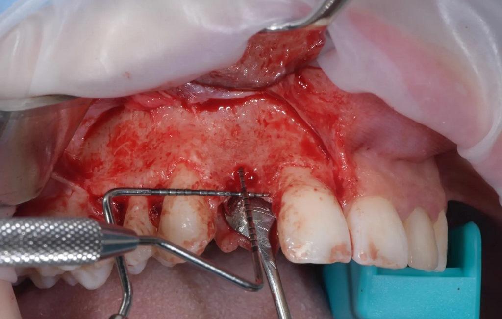 Для эстетического восстановления беззубой области был установлен временный «Мэрилендский мост» (адгезивный мостовидный протез). После восьминедельного периода заживления была проведена процедура вертикальной пластической хирургии. Была проведена антибиотикопрофилактика (амоксициллин по 2 г за 1 час до операции, затем по 1 г два раза в день в течение восьми дней). Перед операцией также сделала промывание 0,2% раствором хлоргексидина в течение 1 минуты, а место операции изолировали стерильной салфеткой.