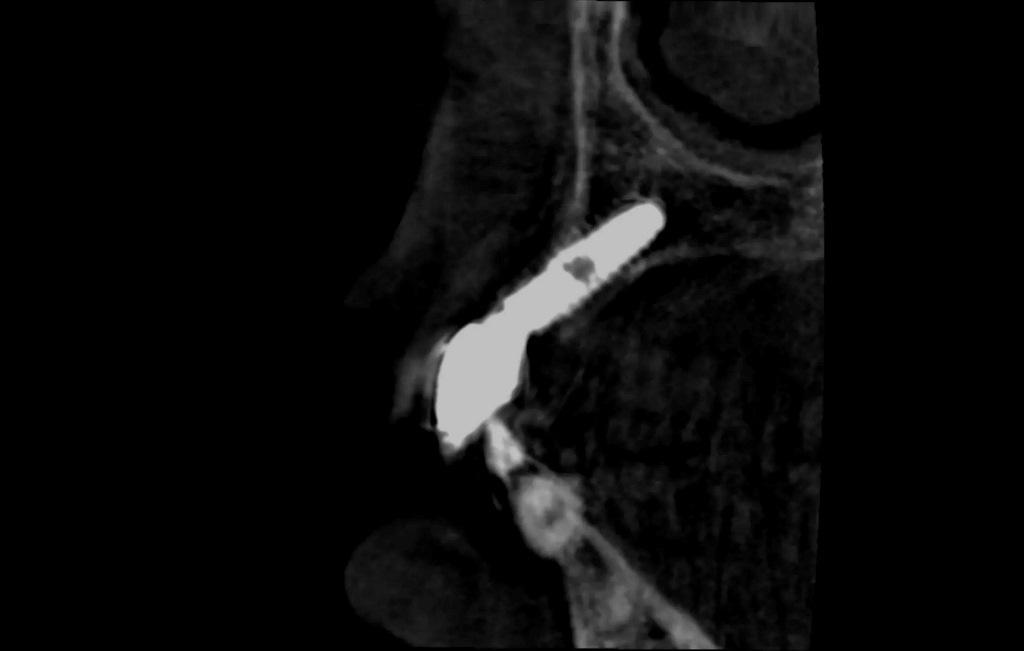 Фото 2: КЛКТ свидетельствует о неправильном расположении лабиального имплантата и потере костной массы.