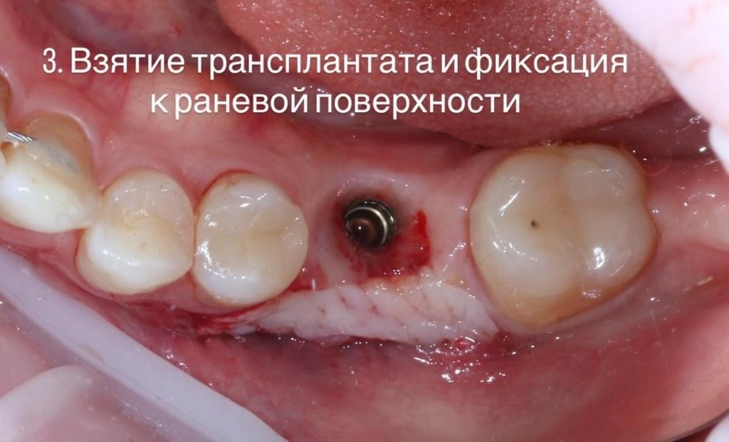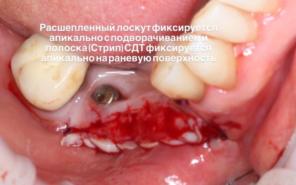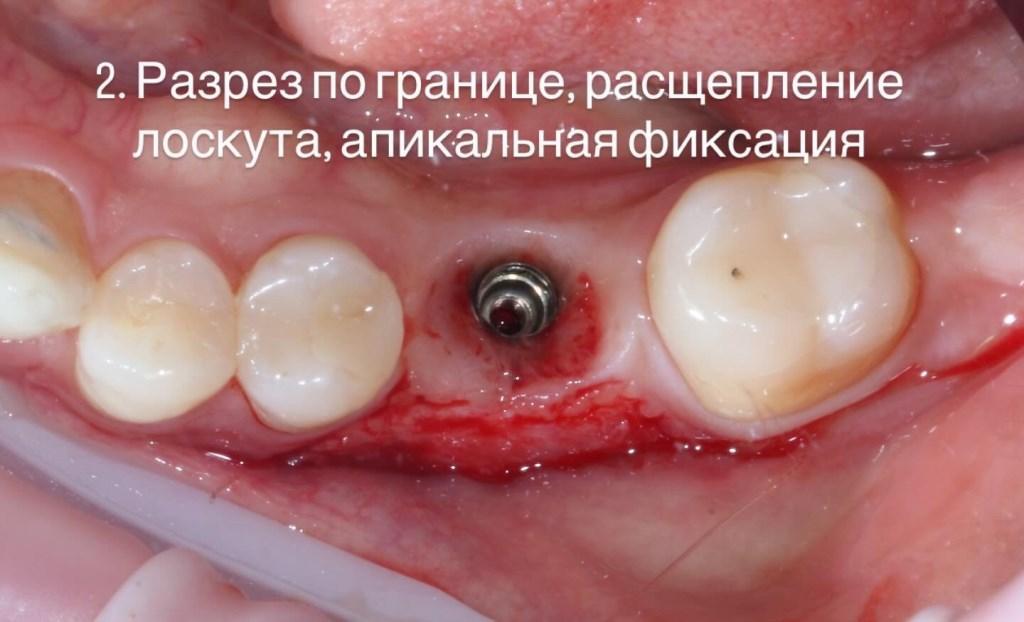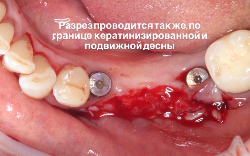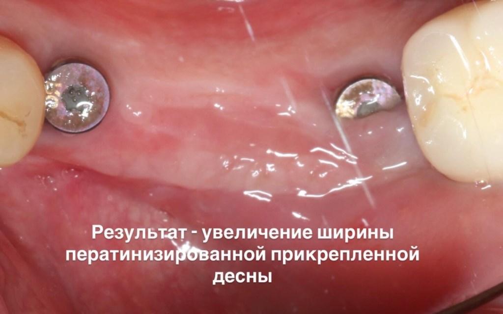 Таким образом мы получаем хорошую прикрепленную кератинизированную десну в области имплантатов, обеспечиваем условия для индивидуальной гигиены, а следовательно, для долгосрочного прогноза сохранения результата имплантологического лечения.