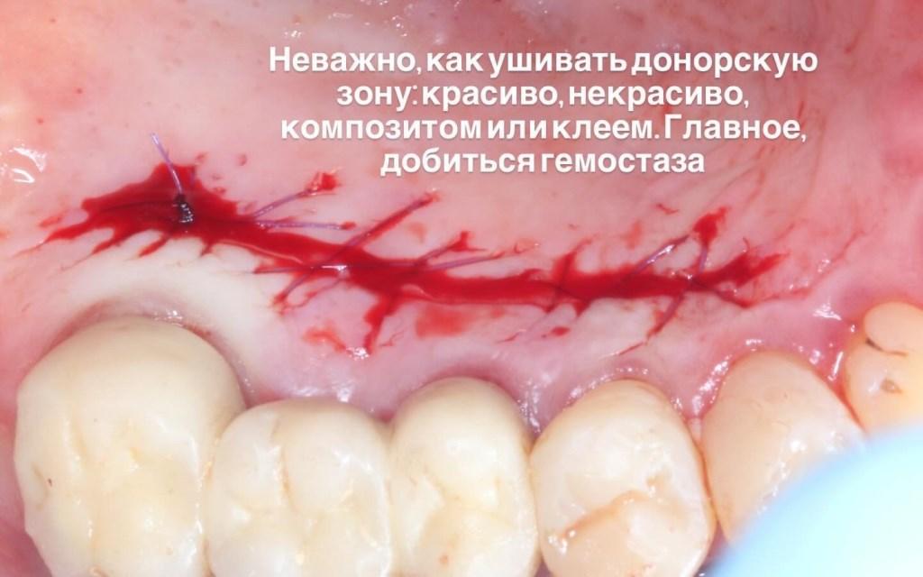 Ведение донорской зоны заключается в создании гемостаза и максимально безболезненной реабилитации. Для этого в рану или укладывают гемостатическую губку под швы (особенно при методике «заплатки»), или закрывают композитным швом из жидкотекучего пломбировочного материала. Рана заживает вторичным натяжением.
