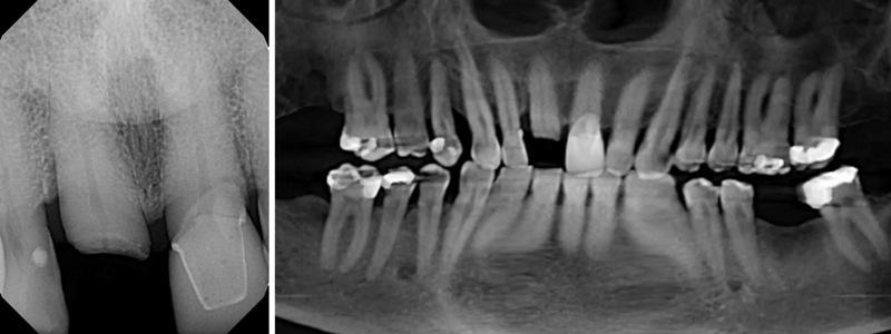 Для оценки сохранности корня на уровне десны и состояния окружающих тканей выполнена прицельная рентгенограмма зуба 1.1 (Фото 2, слева); для оценки зубных рядов выполнена панорамная реконструкция конусно-лучевой компьютерной томографии (КЛКТ) (Фото 2, справа). Проведено пародонтологическое обследование; остальная зубочелюстная система без патологических изменений. По зубу 1.1 отмечалась небольшая утрата кости с дистальной стороны, рентгенологических признаков периапикальной патологии не выявлено. Апикальнее корня зуба № 8, а также медиально и дистально от него имелась достаточная костная ткань для установки имплантата.