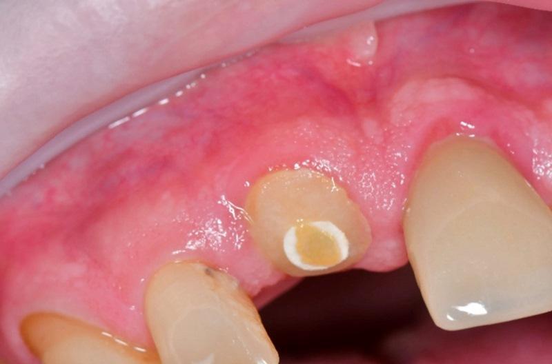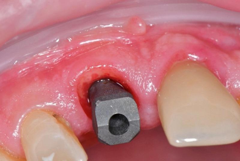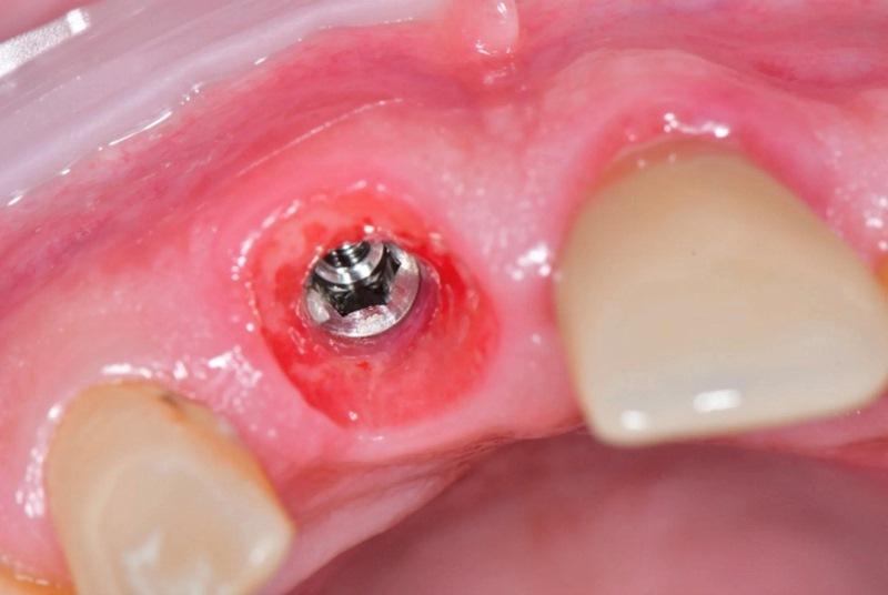 Аллотрансплантат MinerOss (BioHorizons) смешан с PRF, полученным в начале приема, для изготовления смеси «липкая кость». Смесь введена для заполнения гребневых щелей между стенками лунки и имплантатом. Затем на имплантат установлен индивидуальный формирователь десны.
