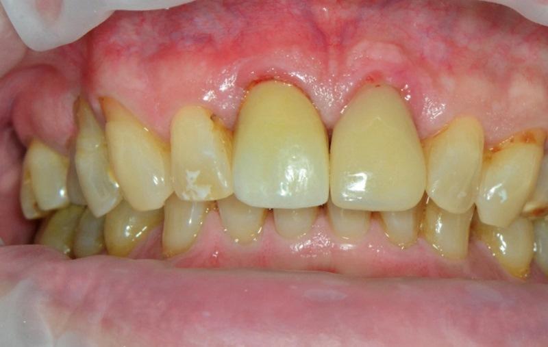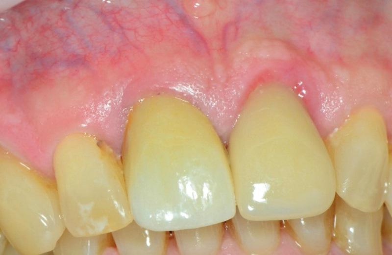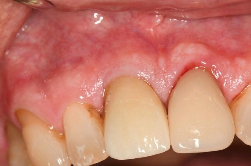 Фото 17. Через 1 год после установки реставрации мягкие ткани вокруг имплантата в области зуба 1.1 без признаков воспаления.