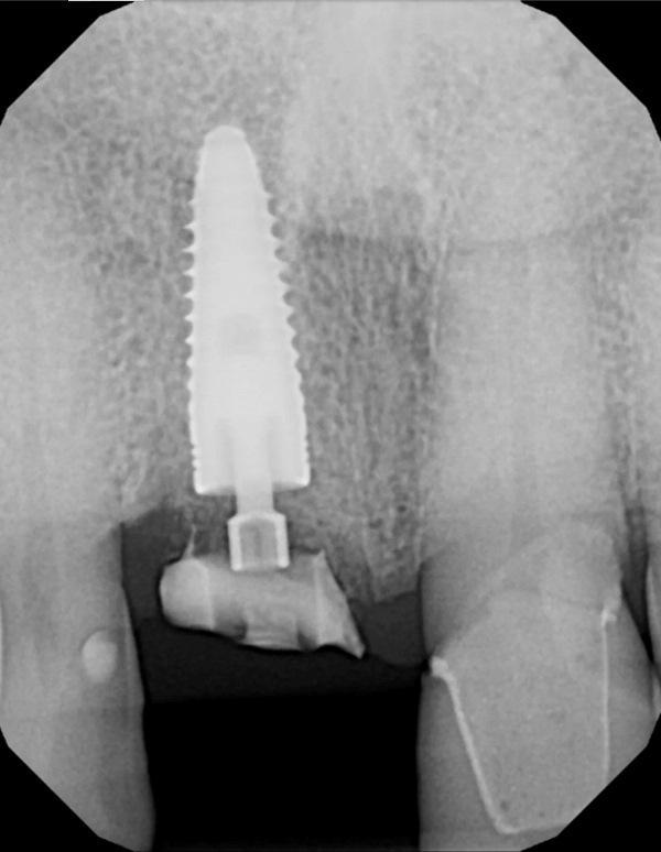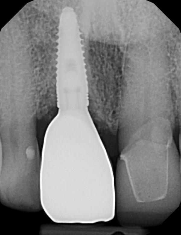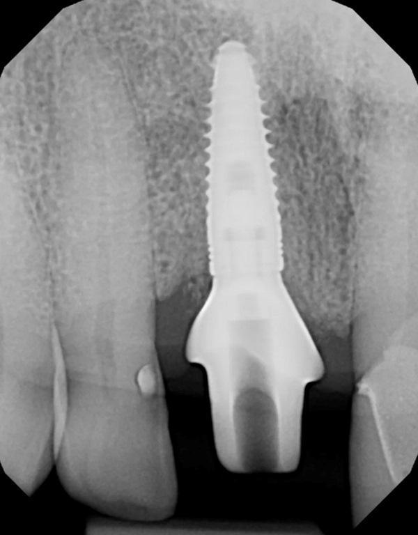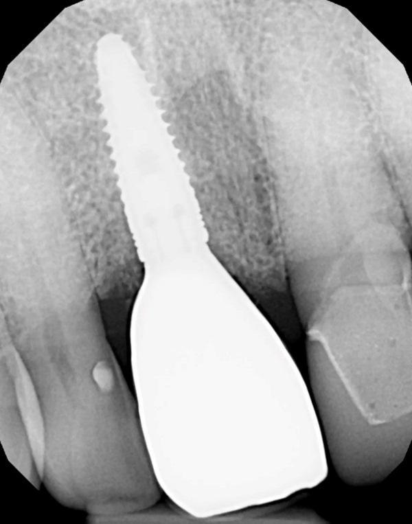 Фото 12. Прицельная рентгенограмма, подтверждающая корректную посадку абатмента в имплантат.