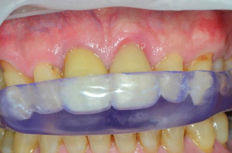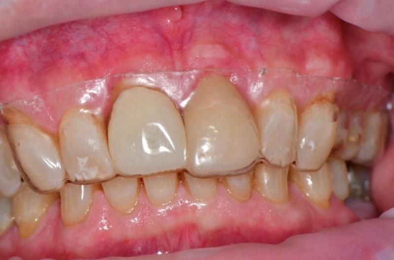 Через неделю пациент пришел на контроль реставрации с опорой на имплантат и получение ночной каппы. В области краев десны воспаление отсутствовало, пациент сообщил об отсутствии дискомфорта после фиксации (Фото 15). Ночная каппа передана, пациенту даны рекомендации по домашнему уходу и использованию аппарата (Фото 16). Запланировано регулярное проведение профессиональной гигиены.
